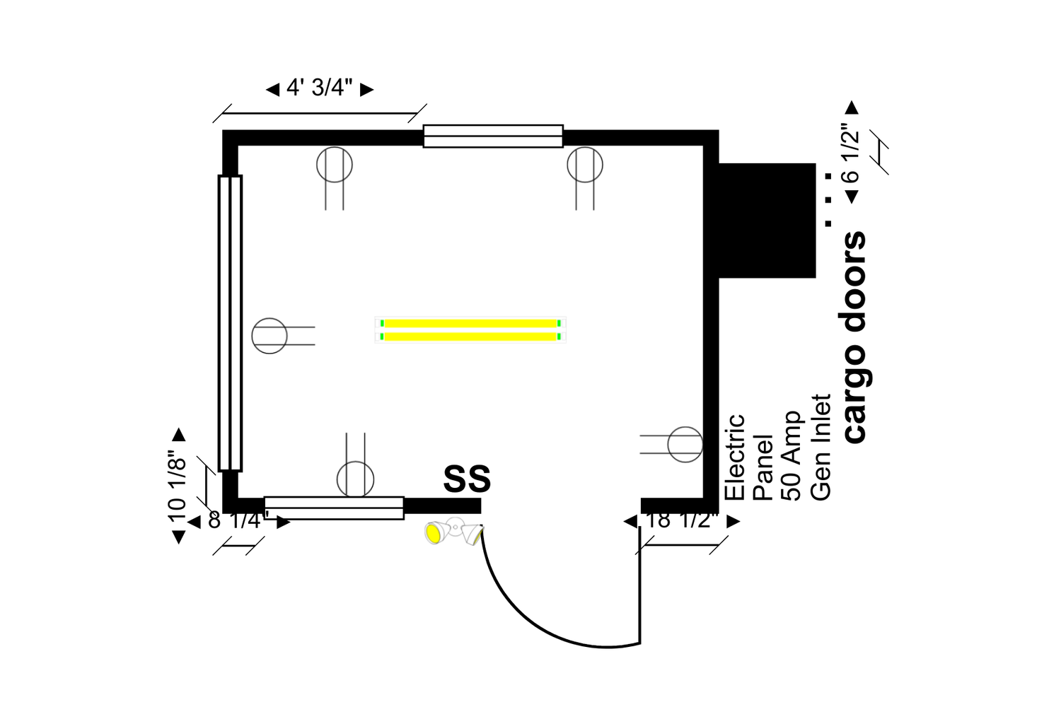 • Comprehensive Electric Package: Includes a 100 Amp service panel, interior 4’ LED lights, an exterior LED floodlight, and multiple outlets for all your electrical requirements. A 50 Amp generator inlet ensures reliable power supply.