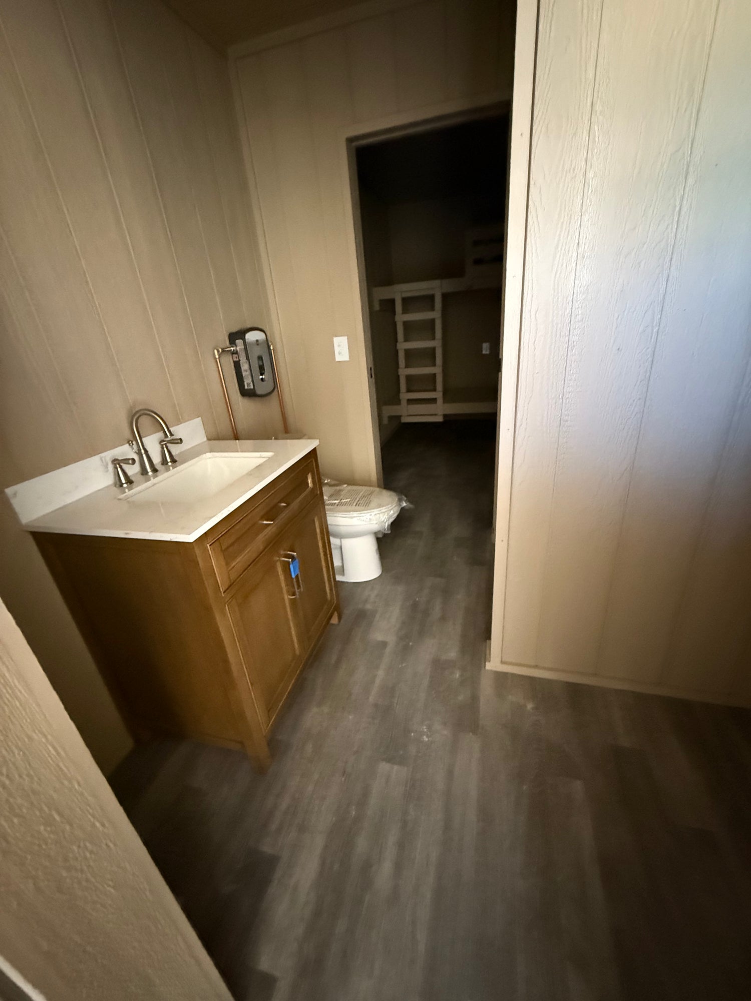 Full Bathroom with 36" one piece shower, Vanity with Sink, Toilet, Tankless Water Heater, and Stackable Washer / Dryer Connections