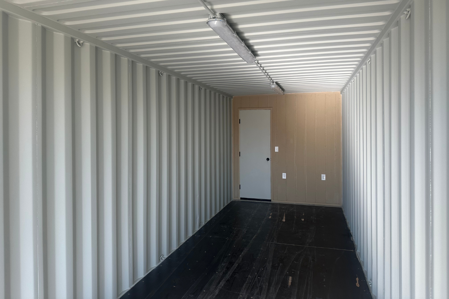 Interior White Swing Door with Keyed Entry from Office to Storage